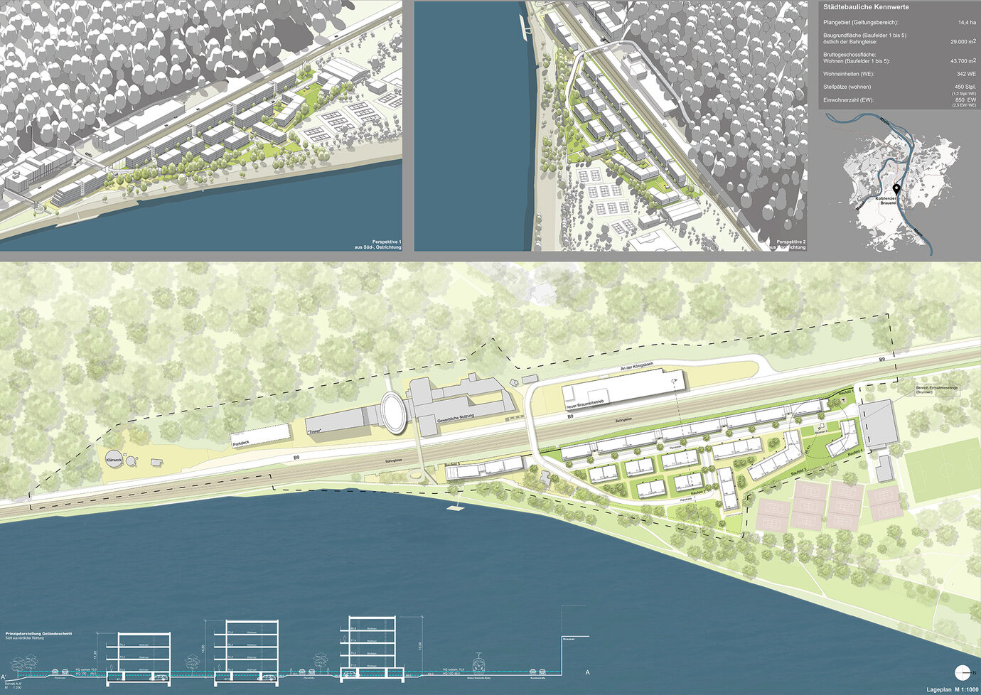 Im Süden von Koblenz an der B 9 liegt das Areal der „Koblenzer Brauerei“. Der traditionsreiche Brauereistandort mit seinem prägnanten Turmgebäude ist seit 2018 Gegenstand städtebaulicher Planungen: Durch eine Verlagerung des Produktionsstandortes der Brauerei können hier neue gewerbliche Nutzungen in Form moderner Gewerbeeinheiten und studentischem Wohnen sowie ein dem Rhein zugewandtes neues Wohnquartier entstehen. Für den östlichen Teilbereich wurde im Dezember 2022 der Satzungsbeschluss gefasst. Die städtebauliche Konzeption von AS+P für das neue Wohngebiet sieht eine drei- bis viergeschossige Wohnbebauung vor. Das seit Jahren brachliegende Areal wird damit städtebaulich deutlich aufgewertet. Bei der Erarbeitung des Bebauungsplans durch AS+P stellte insbesondere die Bewältigung der Hochwasserthematik eine besondere Herausforderung dar, liegt das Areal doch in unmittelbarer Rheinnähe. Es wurden eine Reihe von Maßnahmen zur Hochwasservorsorge und Risikominimierung entwickelt, insbesondere in Form aufgeständerter Gebäude mit weitgehend hochwasserfreien Wohngeschossen und flutbaren Stellplatzflächen. Daneben musste unter anderem auch den lärmtechnischen, naturschutzfachlichen und klimatischen Anforderungen Rechnung getragen werden. Die städtebaulichen Lösungen wurden mit der Genehmigungsbehörde, der SGD Nord, eng abgestimmt und im Bebauungsplan planungsrechtlich verankert. Letztlich konnte für das geplante Wohngebiet ein gutes Regelwerk in Form eines allen Belangen gerecht werdenden Bebauungsplans kreiert werden.