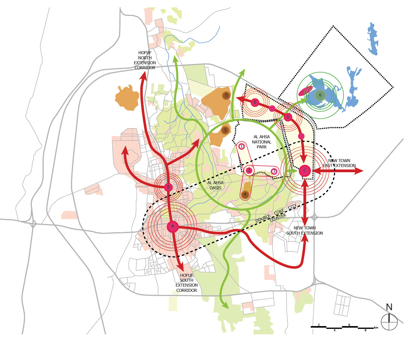 Future oriented sustainable urban master plan for a city extension in the eastern edge of the Hofuf area adjacent to the Al Ahsa palm tree oasis, the largest oasis in the world
