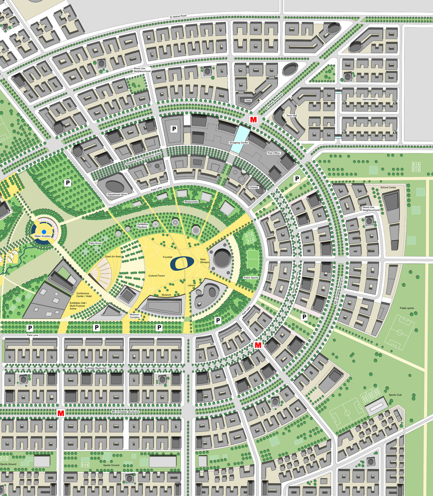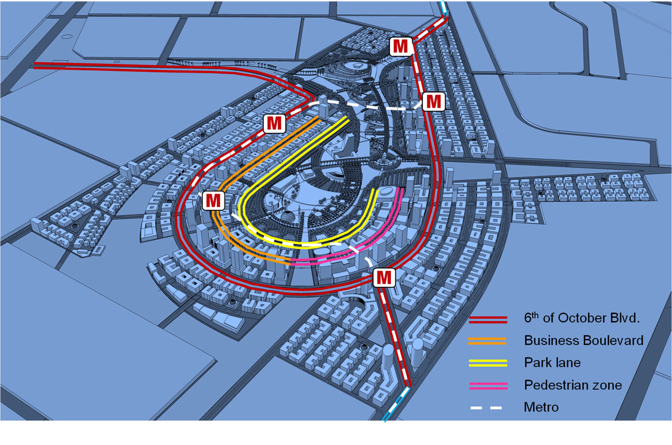 In 2009 the second project phase has been launched to further develop 6th of October City, a three million inhabitant New Urban Community (NUC) close to Cairo. AS+P, in cooperation with Archplan Cairo, have been assigned to prepare the conceptual master plan and detailed master plan for the new city centre and the southern expansion areas. As one of the special competences of AS+P, the transportation network of the new urban areas has been developed in an iterative process in close coordination between urban designers and transportation planners. This approach funds the basis for a sustainable city development. The macro-scale planning of the conceptual master plan integrated considerations for all modes of public transport for the entire city. Furthermore, it defined the hierarchic road network and made proposals for various road cross-sections. The detailed master plan of the new downtown area along the central spine refined the results of the conceptual planning stage. Multi-functional urban boulevards and streets have been developed to ensure that the transportation infrastructure meets the expectations of a modern city centre as well as the traffic demand of the growing regional centre.