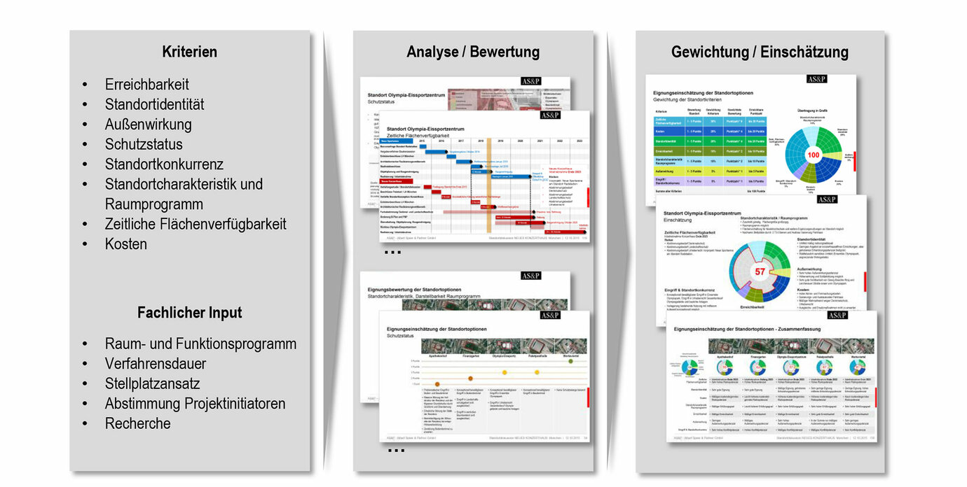 As the home of the Bavarian Radio Symphony Orchestra and the Munich Philharmonic, the federal state capital Munich boasts two symphony orchestras of the highest international standard. However, only the Philharmonic has a venue of its own in the form of the large auditorium at the Gasteig cultural center which, given its existing volume, does not have optimum acoustics for symphonic concerts. This, plus the fact that shared use of one venue by two orchestras in Munich is the subject of heated debate, has in the past led to intense discussions regarding new concert hall locations. In the spring of 2015, AS+P initially produced a preliminary study relating to the debate surrounding the location of a new concert hall. As part of the further planning phase, AS+P was tasked with examining the suitability of five locations in greater depth and highlighting possible realization risks and conflict potential. Against this background the locations were examined based on the criteria location identity, location characteristics, availability of space, and costs, and their suitability for the construction of a concert hall evaluated comparatively. On the basis of a specified layout, a schematic concept adapted to spatial and structural circumstances was developed for each location. Using weighted criteria, the suitability of the locations was then assessed, and recommendations derived for the ongoing process as part of the realization of the project.