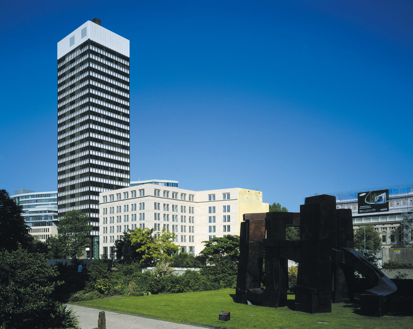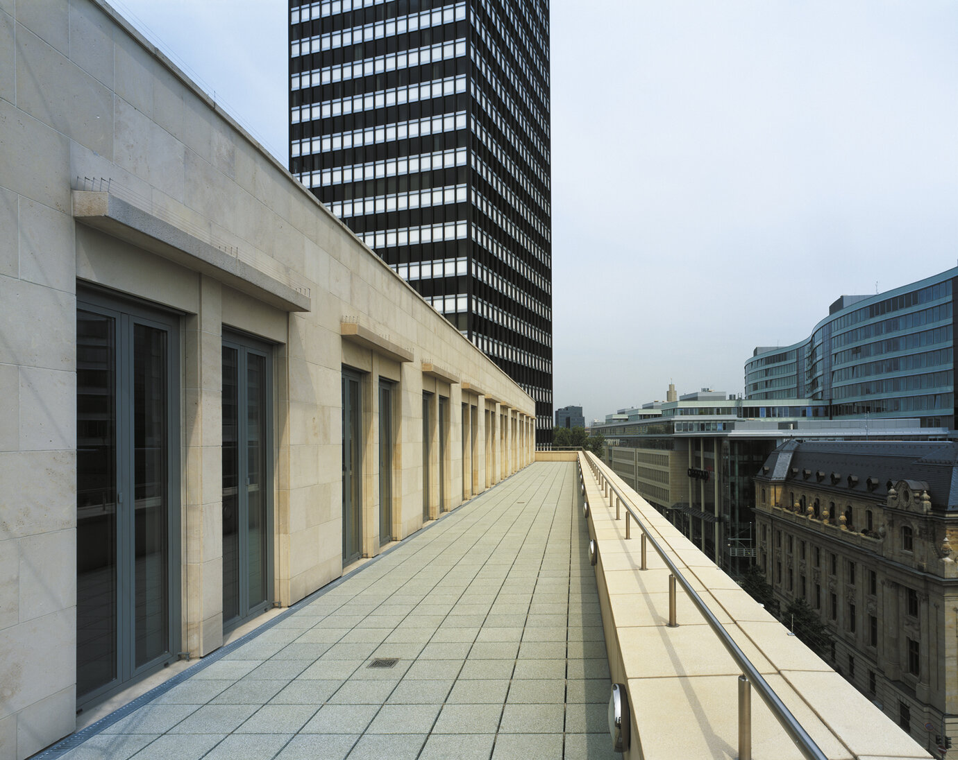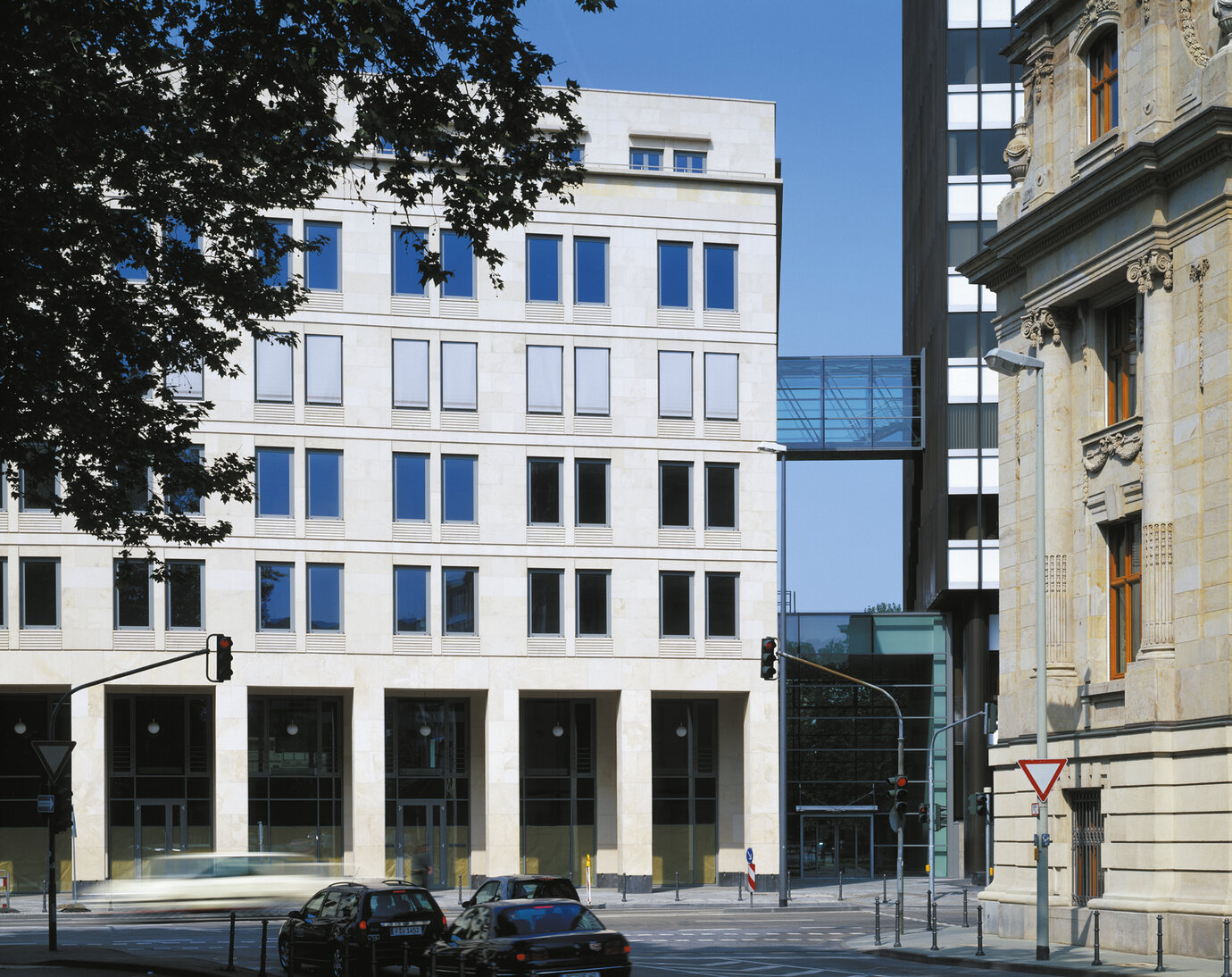 The DZ-Bank has added a new wing to its office tower at the edge of Frankfurt's bank quarter. The new building enables the bank to concentrate formerly dispersed units on the site of its headquarters. Planning was based on building studies, which AS+P made for the entire western edge of the Opernplatz. AS+P served as the responsible general planner. Two-storey arcades open the seven-storey, closed-block structure towards the street and the structure culminates in a staggered upper floor. The scale of the structure as well as the materials used in its stone façade form a counterpart to the historic ensemble across the plaza. The building's architectural language, however, is clearly contemporary.