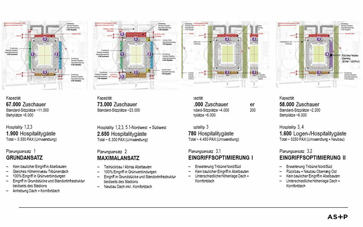 Functional stadium expansion planning based on different scenarios and taking planning law, transportation, noise protection, and economic aspects into consideration