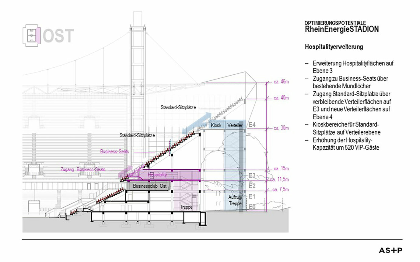 Located in Cologne’s Müngersdorf district, RheinEnergie Stadium is where the 1. FC Köln football club plays its home matches in the Bundesliga. Given the close ties between fans and the club, the stadium is only to a limited extent able to meet the consistently high demand for tickets. With a view to increasing ticketing revenues at the stadium, the City of Cologne, Kölner Sportstätten GmbH, and 1. FC Köln mutually agreed that AS+P should prepare a feasibility study on the possibilities for expansion of RheinEnergie Stadium. In order to be able to identify the project’s potential and risks at an early stage through functional planning based on different scenarios and reach a sound basis for assessing the prospects of these actually being realized, alongside deliberations about concepts for the expansion of the stadium and transport, external experts from the fields of structural engineering, planning and building law, noise protection and economic viability were also integrated in the planning process. The alternative planning methodology devised by AS+P on this basis identified key indicators (capacities proportionate to spectator groups, ground plan sizes, size and layout of the land, heights, etc.) formed the basis of the external experts’ assessments and will be used in the course of possible further stages of the project along with subsequent economic feasibility studies to deduce the potential costs and earnings the project would entail for the client.