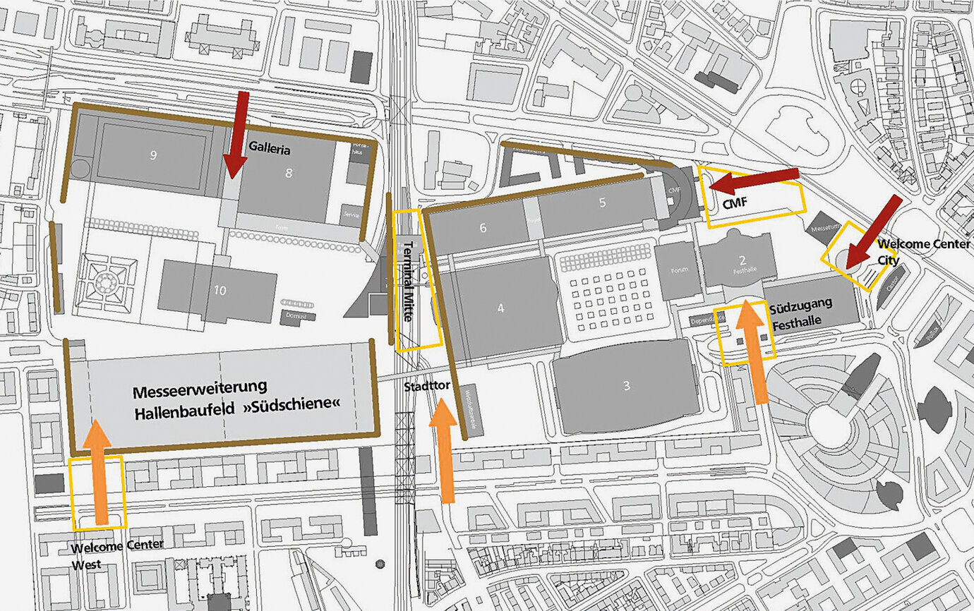 The Frankfurt fairground has a unique identity and is characterized as the "downtown trade fair" because of its location. In terms of being visitor friendly, Frankfurt's spacious location in the European road and railway network, proximity to the airport, and being within walking distance from the train station create huge advantages. On the down side, because of these features high standards are expected of the organization and functionality of the premises. The master plan developed by AS+P is due to be completed and implemented by 2020. It outlines fundamental urban planning, functional and transportation frameworks for future planning. The plan also defines gateways with neighbouring city quarters. Herewith, transportation and functional organizations will be able to develop a concept for an internal and external transportation system. Further developmental emphasis is placed on the improvement of visitor concentricity (circulation) through the addition of Via Mobile systems as well as the construction concept for the expansion of the grounds. Additionally, creative revitalization proposals of problematic sectors were created and a step-by-step plan for the successive restructuring of the fairgrounds was developed.
