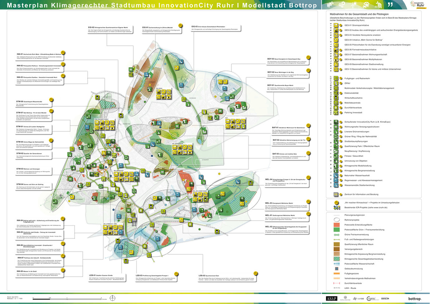As consortium leader of an interdisciplinary consortium with the regional cooperation partners Gertec (Essen), Büro Drecker (Bottrop) and Conlab (Düsseldorf) AS+P drew up the master plan and the innovation handbook for the InnovationCity Ruhr | Model City Bottrop. The master plan process, which was scheduled to last 18 months, and the compilation of an innovation handbook are a mainstay of the entire "InnovationCity Ruhr | Model City Bottrop" project, and are unique in this form. They underpin the trend towards cities that will suit the local climatic conditions, while at the same time improving the quality of life. Aspects such as urban development, energy, and mobility were combined in an integrated planning process. Furthermore, existing individual projects were included in a joint framework, and any gaps with regard to content filled. From this, implementation strategies were derived and concrete steps, players, and methods of financing defined. On the basis of the knowledge gleaned, an innovation handbook was compiled, which, citing the model city of Bottrop as an example, illustrates how urban redevelopment that suits the local climatic conditions can be implemented in other cities. As such this project stands to benefit not only the inhabitants of Bottrop, but those of other cities and regions as well.