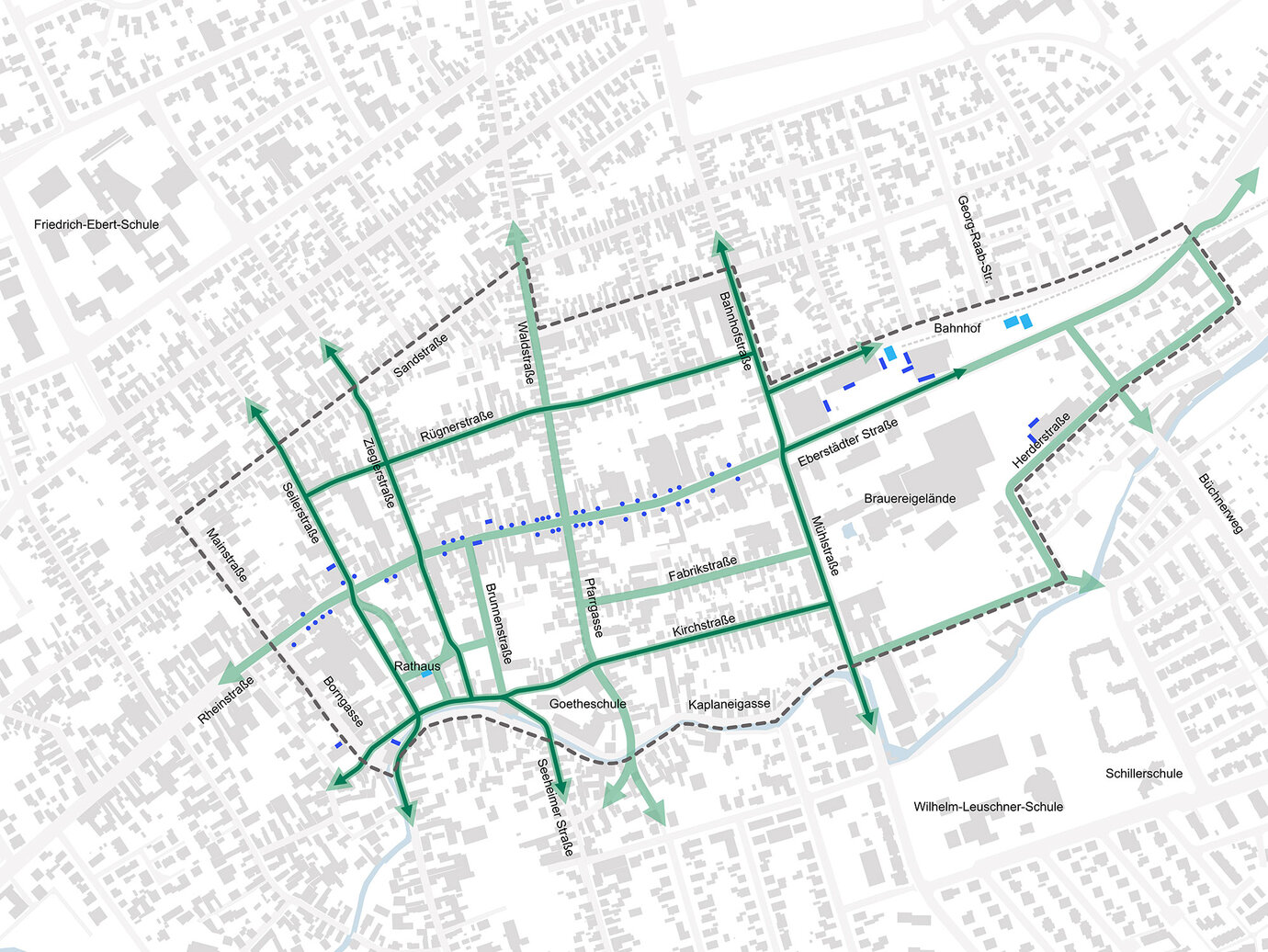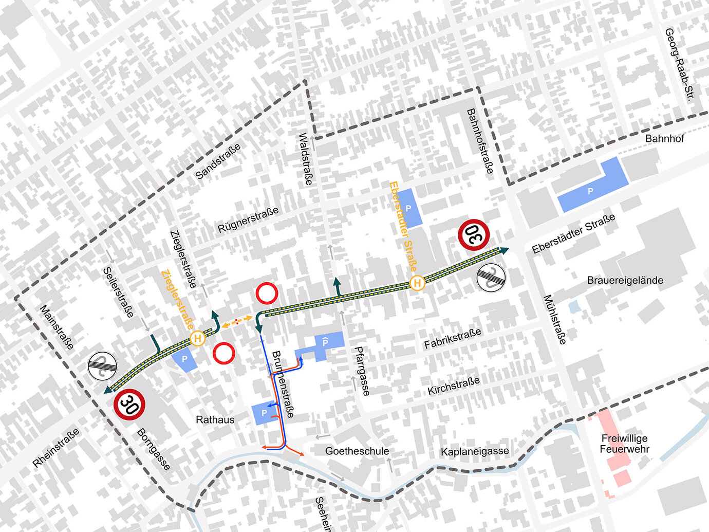 In Pfungstadt, several initiatives have already been introduced to ease traffic in the town center, including the western and northern bypasses. While these measures have brought noticeable improvements, traffic volumes in the core area remain high. The desire for additional traffic relief is strong. The heavy through traffic, particularly along Eberstädter Straße, continues to cause congestion and creates a sense of insecurity for cyclists. The central area partially offers limited space for pedestrians.
