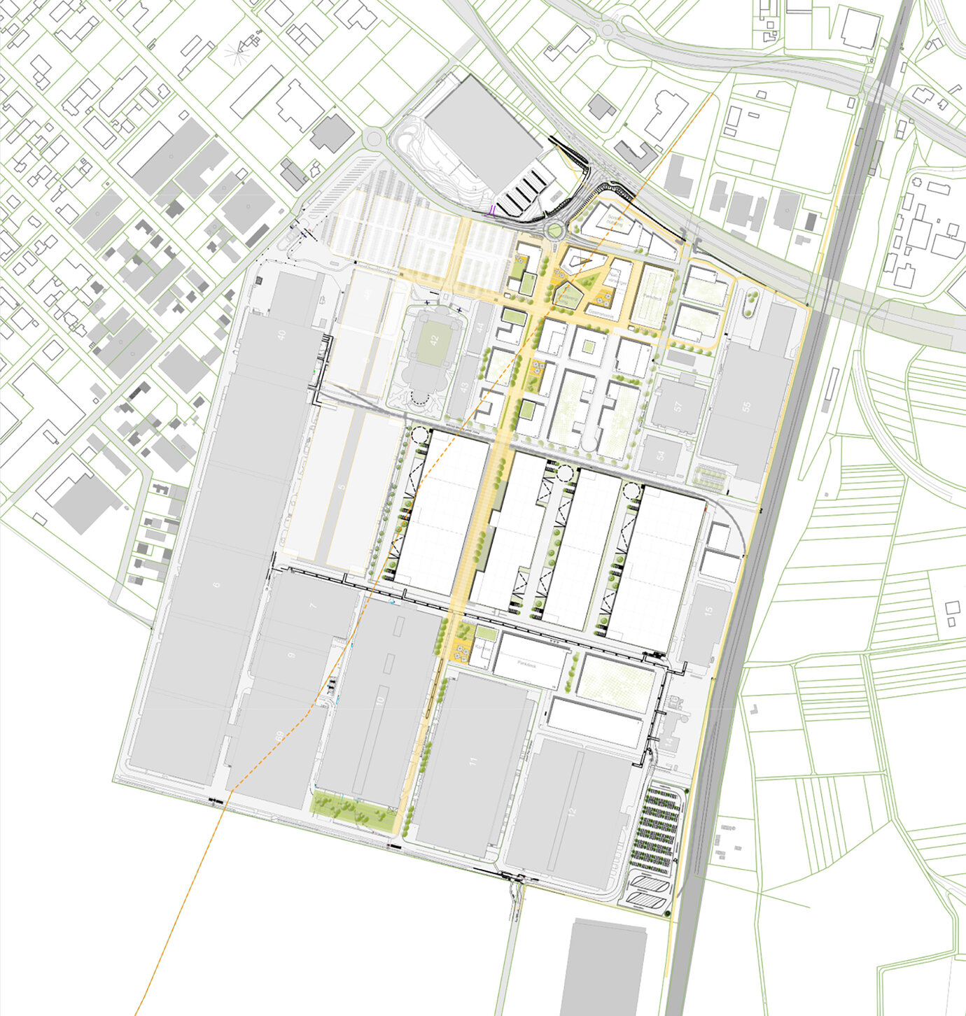 As part of a realignment resulting from the digitization of the media and printing industry, Heidelberger Druckmaschinen AG intends to optimize the use of land at the main plant site in the municipalities of Wiesloch and Walldorf by undertaking suitable densification measures and allocating vacated areas to new commercial uses. At the same time, cycle traffic in this area is to be made more attractive with the closure of a direct gap between the Wiesloch-Walldorf train station and existing cycle routes in the south. In order to lay the legal foundations for this cross-zone planning, development plans are being drawn up in parallel in the towns of Wiesloch and Walldorf. Here, AS+P is working closely with the municipalities to prepare the documentation required under planning law for the planning area, which covers a total of approx. 47 hectares, based on a framework plan it prepared previously. In parallel to this, AS+P is also coordinating the various parties involved (representatives of the municipalities, Heidelberger Druckmaschinen AG, specialist planners) and managing the planning procedure.