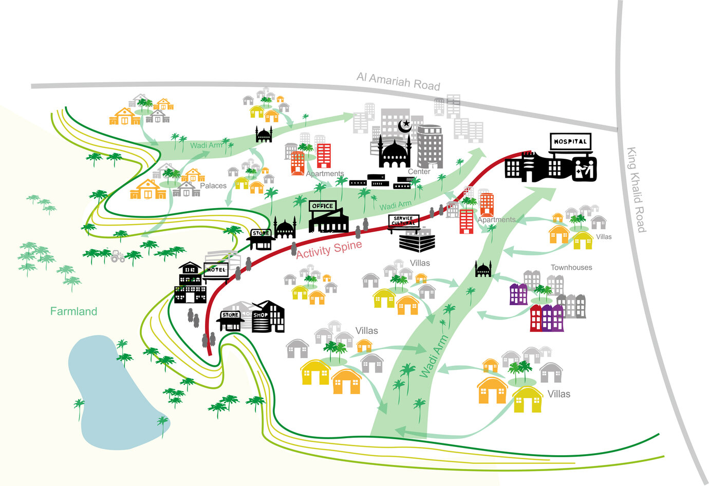 AS+P has been commissioned to develop the Master Plan for an exclusive site just south of Al Amariah Road, directly adjacent to Aga Khan Award-winning Wadi Hanifah, and north of Ad Deriyah with its UNESCO heritage protected old town at-Turaif. The focus has been to draw on the benefits offered by the wadi and to develop this area to an upmarket, predominantly residential, new district of Ad Deriyah. The total investigated site area of 8,659,750 m2 also included the wadi edge and farmland occupying the side valleys of Wadi Hanifah. The master plan devises a distinct urban heart that is structured around a district center, located at the main thoroughfare. Within the urban core higher densities are planned, mostly apartment buildings of varying height. However, most of the site is reserved for low density residential development, with large palace plots oriented towards Wadi Hanifah. The entire development site will provide home for approximately 88,000 inhabitants. To reduce traffic and provide an excellent quality of life, the master plan has been developed following the principles of a "city of short distances", where essential services and daily needs are within comfortable walking range. Schools of all grades, neighborhood shopping, mosques and parks are well integrated, so that they can be reached comfortably by foot, reducing the need for unnecessary car trips. The backbone of the development will be the activity spine leading from the district center to a leisure and entertainment cluster directly at the wadi edge. The proposed development will be the first to offer public access to the edge of Wadi Hanifah, providing a welcome new attraction for Riyadh.