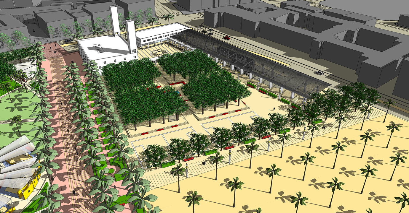 The planning objective was the urban renewal for the heterogeneous Al Barkiyah District. Historic elements, mosques, existing administration complexes and new public transport infrastructures must be integrated in a robust urban fabric. The planned urban garden consisting of three main landscape areas, knits the various functions together. The ceremonial axis is flanked by illuminated king palms and leads to the historic Al Barkiyah Tower. Along the sides, "green rooms" offer protected spaces for family seating. The formal, hardscaped tree square is defined by the mosque and terminal building complex which is set at an angle at the street inter- section. This sector of the urban garden can be used by a multitude of different functions: shaded resting under the elevated tree platforms, sports and play areas on the areas bordering the Eid Prayer Ground. The park is designed with a curved edge toward the West. It accom- modates attractive areas for leisure and recreation. The ondulating tree design is contrasting to the strict geometry of the tree square. The park contains lawns and limestone walls, offering protection against the noise of the neighbouring streets. Small pagoda squares and seating steps complete an attractive pedestrian environment.