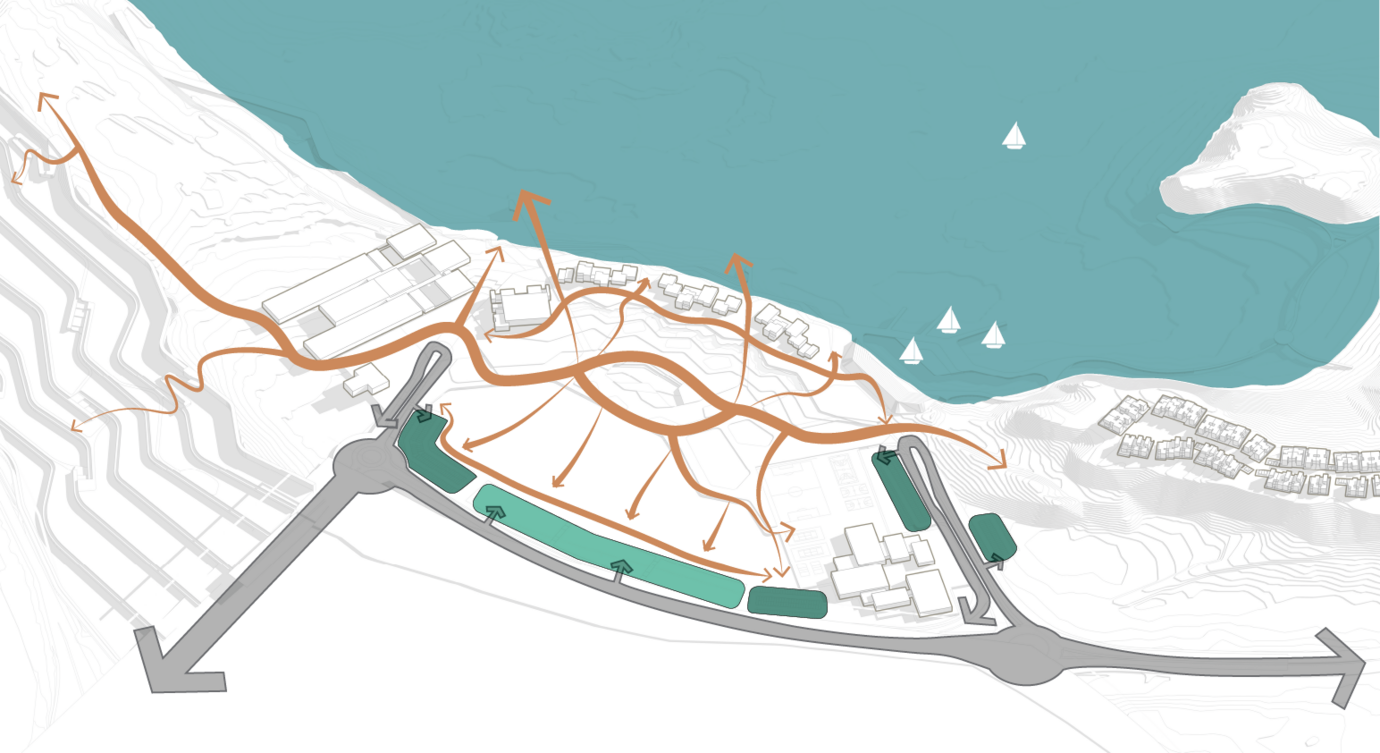 Beyond internal circulation, the mobility framework links the development to the regional context through a layered transport system. A cable car connection between the lakeshore and the historic city center offers a direct, car‑free link and a unique visitor attraction, complemented by external on‑demand shuttle services connecting to the airport, train station, and nearby cities.