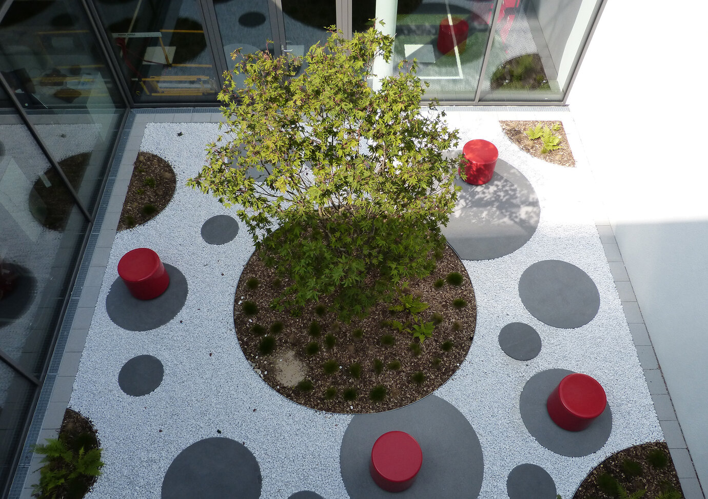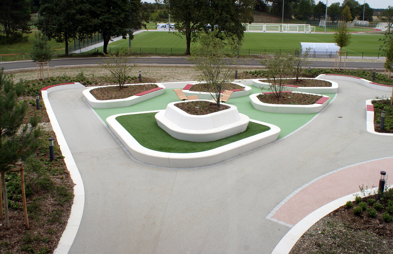 In 2014 AS+P was commissioned not only with planning the construction of the buildings but also with devising a design concept for the outdoor areas at the new Bayern Munich sports ground and youth academy. An overarching design concept for the 3.8-hectare site was then developed together with experts in the fields of transport and sports venue planning, and nature conservation. As of Development Phase 5 the project is being taken forward as a consortium together with Wendler Landschaftsarchitekten in Munich. At the new main entrance the thoroughfare will be accentuated by an existing wall with gabion retaining walls which, accompanied by columns of hornbeams, guide new arrivals to the training ground. The main entrance area will feature a clearly configured plaza with the same surface throughout; strips of plants with blossoming trees will give it structure and underscore its green character. Providing access to the training ground from north to south and east to west, the main paths for pedestrians and cyclists will adjoin the main entrance area. The long distances will be punctuated by dynamic, curved paths with small relaxation areas where striking groups of trees comprising oaks, hornbeams, and pines make for visual references. At the end of the paths, small plazas mark the entrance to the training areas. Slightly modelled broad rows of indigenous plants accompany the paths, which otherwise run through extensive, thin areas of grass. Rain water seeps away through dips in the grass and infiltration ditches.