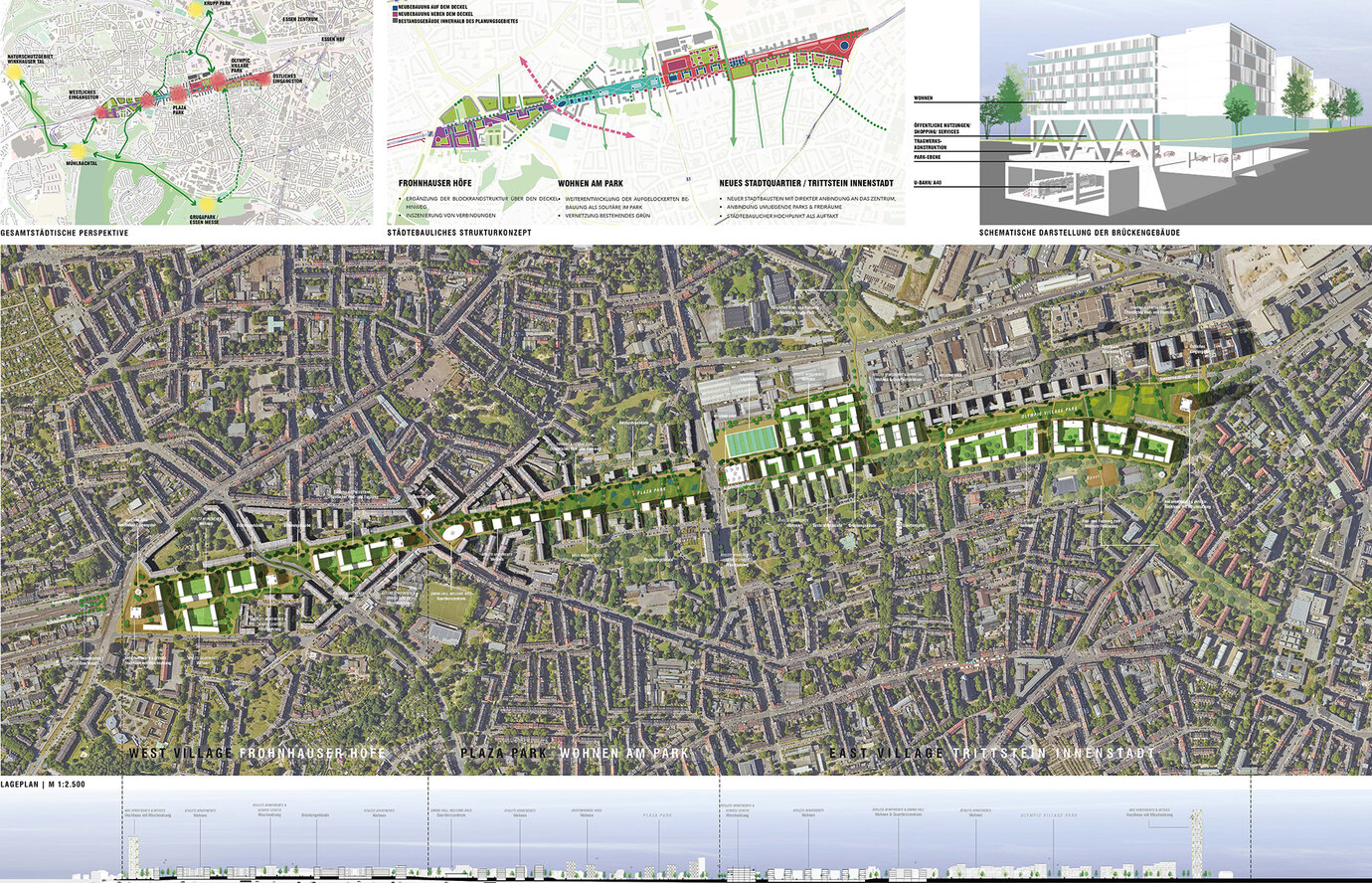 Interdisciplinary feasibility study on how to develop an integrated section of the urban fabric to the west of downtown Essen on a covered section of the A40, with initial use as an “Olympic village”