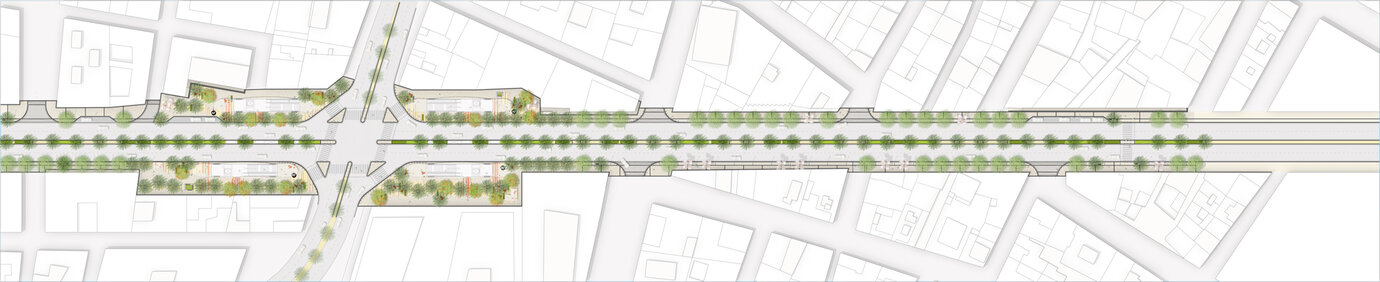 The Arriyadh Development Authority (ADA) is currently implementing an ambitious public transport system for the entire city of Riyadh. Core of this system will be an extensive METRO network. The design of the METRO system is progressing fast and is already in an advanced planning stage. This is seen as a historic opportunity to transform the road space along the METRO corridor, which is currently focused exclusively on the car. The aim is a holistic solution - integrating all users - that will help the success of the proposed METRO. In this context, AS+P was commissioned by the ADA to develop an Urban Design & Streetscape Manual (UDM), giving international planners mandatory functional and design guidelines. Based on the prevailing urban context, Urban Street Types have been developed, which then determine the parameters for the dimensioning and design of the road space. A clear design process and a variety of 'tool boxes' with applicable design elements have been defined. A key aspect has been the integration of the different transport modes. Taking into account local circumstances, a number of guidelines have been defined, for example regarding junction layout and the location and interaction of bus stops, crossings and bicycle paths. Typical designs demonstrate the application of the manual on realistic scenarios along the METRO corridor.