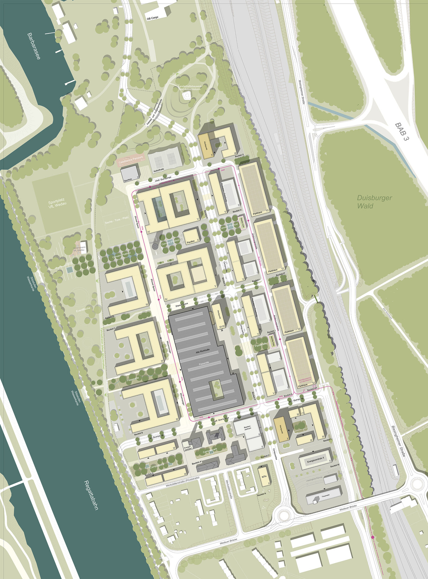 Städtebauliche Rahmenplanung für einen High-Tech-Park mit Campus der Universität Duisburg-Essen auf einer Bahnbrache. Integration von Flächen des Sportparks Wedau