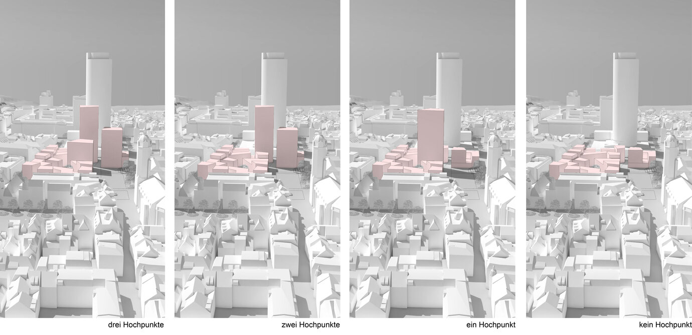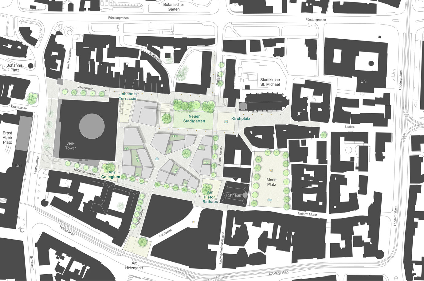 In the heart of Jena's old town for decades sized about 12,250 m² the so-called Eichplatz area has waited to be given a new spatio-functional lease of life and design. Possibly, its special location at the foot of the 144 m-high JenTowers, is why it attracts the locals' great attention. The key question was essentially not how, how much or for whom things should be built. Rather, the emphasis was on making certain the citizens were included in the development and design of the zone. In a three-stage inclusion process involving concentrated active workshops and public presentations, together with the inhabitants a framework urban planning concept was developed and coordinated. All the constructed elements in the new quarter take the shape of small-sectioned standalones, i.e., have no semi-public or private rooms on the ground floor. The public space meanders between the built elements in a constant interplay of narrow confines and expanse. The upshot: a system of courtyards and alleys that invite you to visit the quarter and are intended to offer various opportunities to tarry a while here. The citizens insisted at the time that alongside the network of inner pathways, the connecting points to the surrounding urban space were aligned as closely as possible to the existing scale of the urban fabric. Narrowness is a mood-defining characteristic of old town Jena. The framework concept can be realized with or without high-rises.