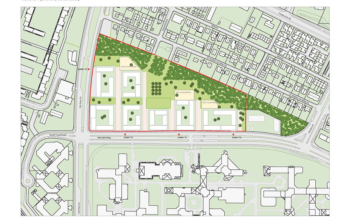HIH Real Estate GmbH intends to get planning permission for the construction of a residential quarter with around 750 residential units on the “northern car park” on the Siemens site in Neuperlach. Alongside apartments the development will boast nurseries, social facilities such as a senior citizens’ meeting place, retail outlets, and commercial activities, e.g., a medical center. Car park decks will be built on the Siemens site that abuts to the south, and the existing parking spaces will be moved to the “eastern car park”.