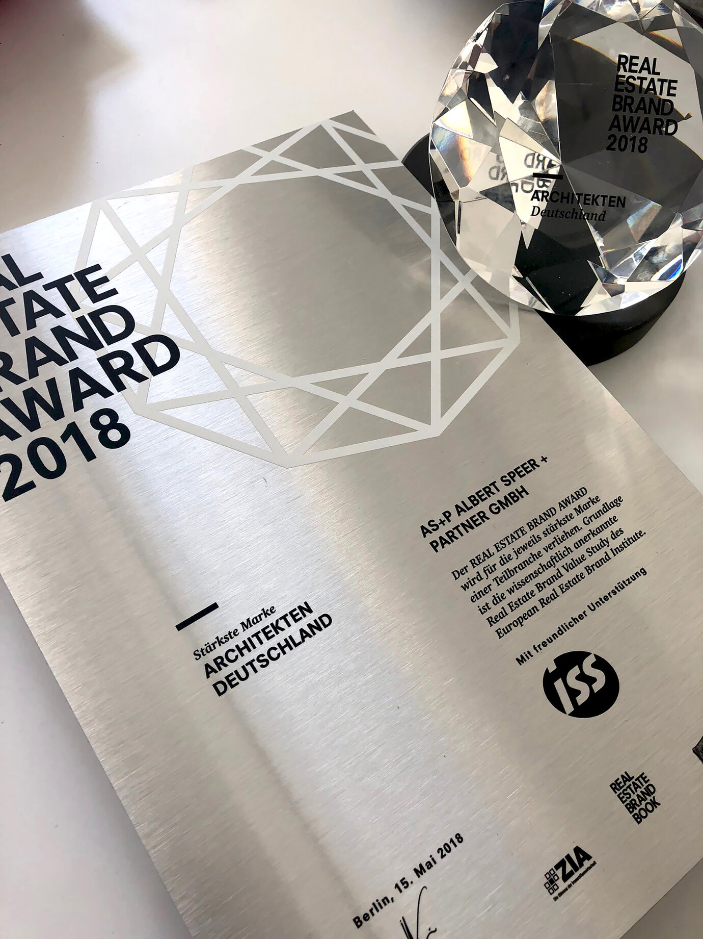 For the third time in a row AS+P was honored as the "Strongest Brand among Architects in Germany" in the REAL ESTATE BRAND AWARDS. Martin Teigeler, partner and member of the Executive Board, and head of communications Susanne Wellershaus accepted the diamond on behalf of AS+P on Wednesday at the prize-giving ceremony in Berlin.