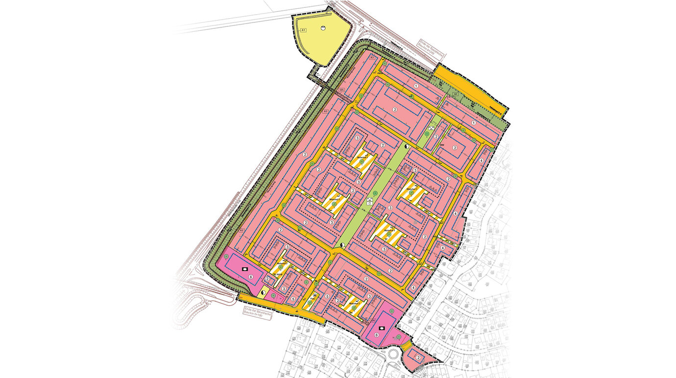 The land-use plan by AS + P ensures the legal planning issues for the new residential area. Due to the surrounding infrastructure, the consideration of noise protection played an important role during processing. Plan © AS+P Albert Speer + Partner GmbH