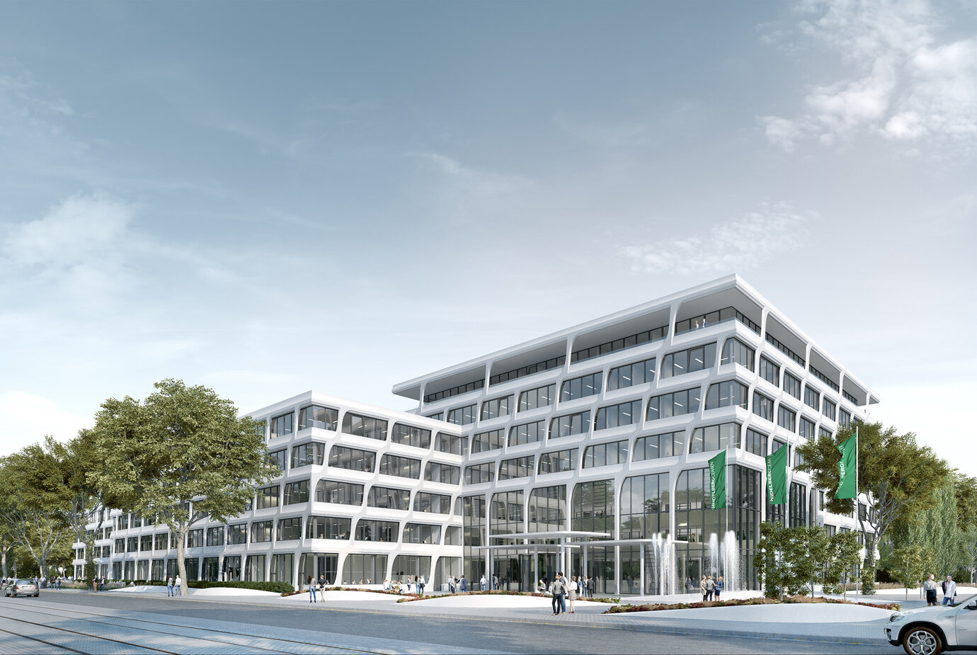 View from Berliner Straße on the planned new headquarters for HeidelbergCement, © AS+P Albert Speer + Partner GmbH, visualization: HH Vision