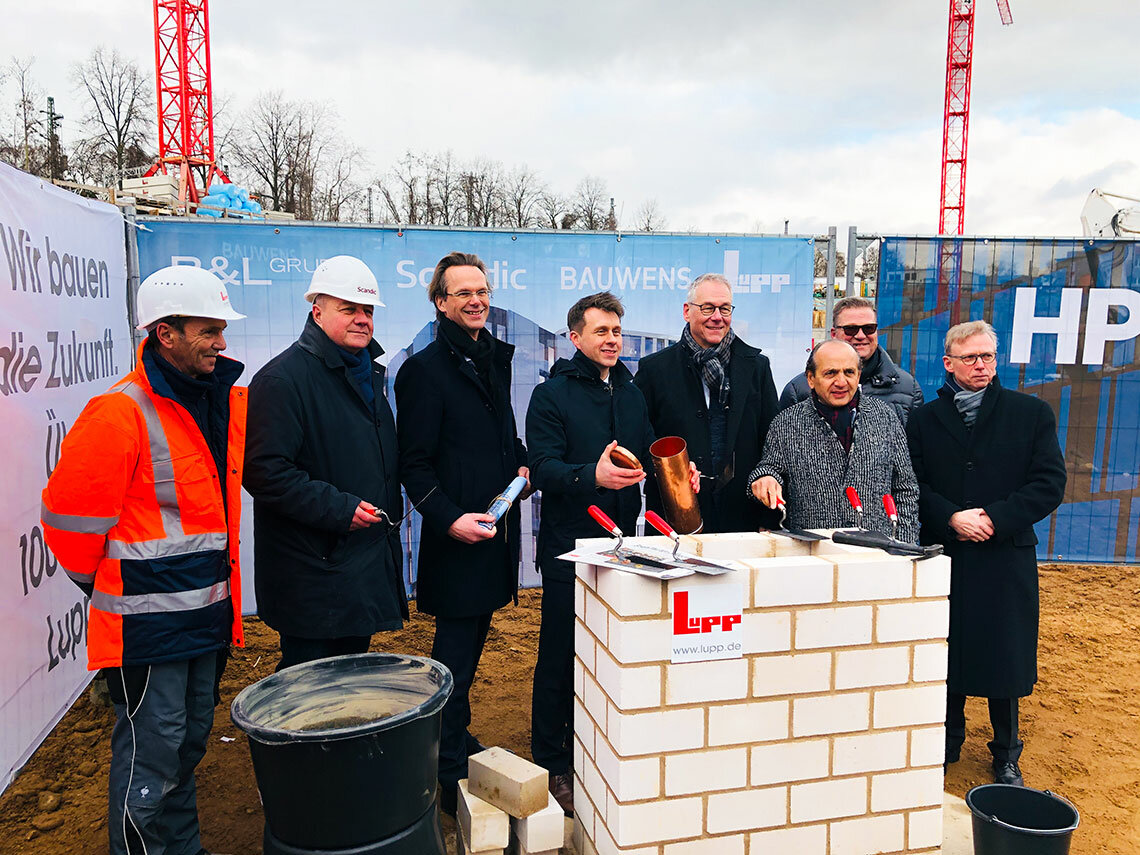 One ceremony, the laying of two foundation stones –work starts on the Scandic Hotel and the second phase of construction for Frankfurt’s Hafenpark district
