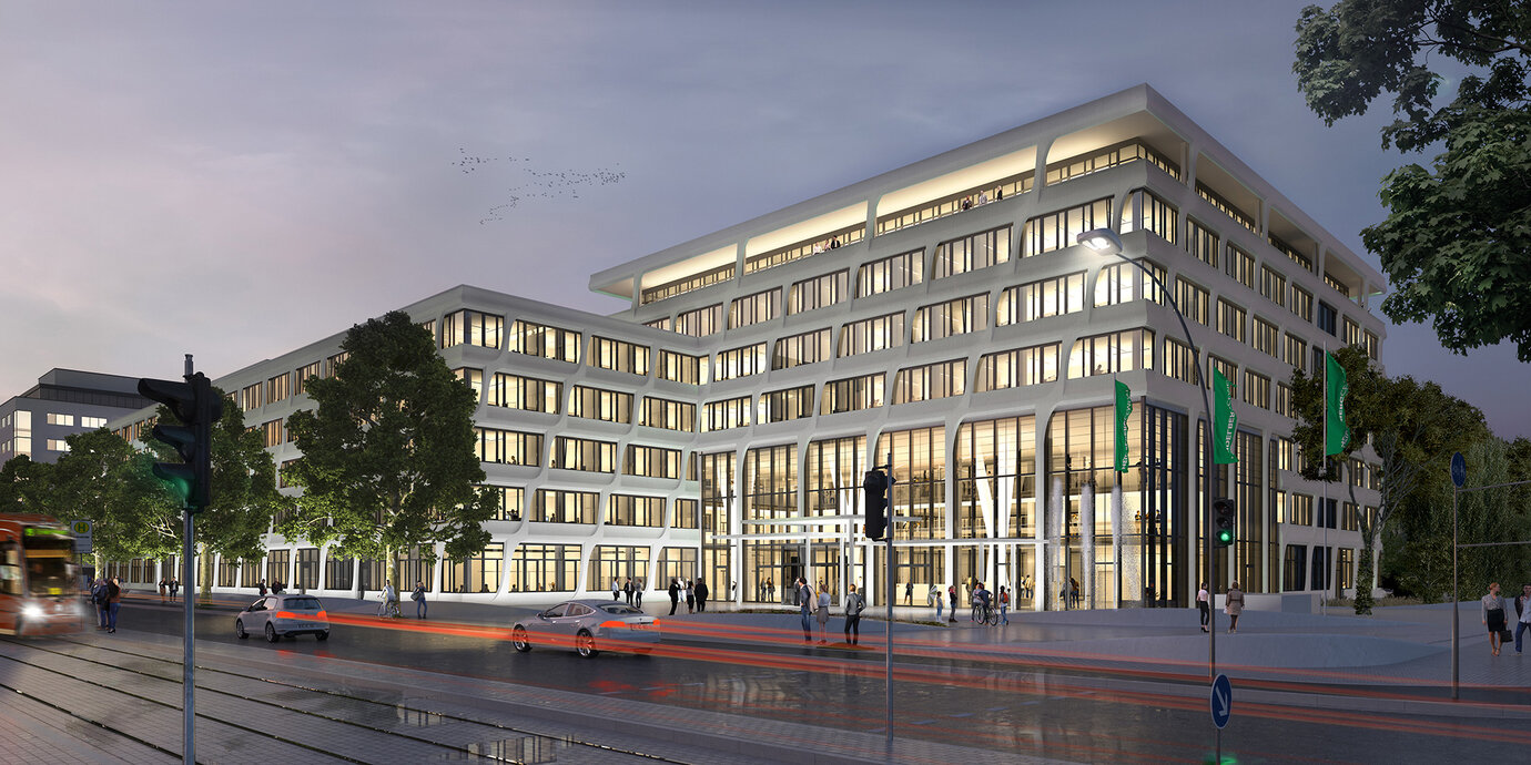 Das nachhaltige, effiziente Ensemble besteht aus mit drei miteinander verbundenen, fünf- bis siebengeschossigen Baukörpern und bildet einen erkennbaren Auftakt an der Berliner Straße. In seinem Inneren entsteht mit einer großen Konferenzzone und zahlreichen Tagungsräumen, einem Casino mit Großraumküche sowie einem modernen Mitarbeiterbereich mit multifunktional nutzbarem Sportraum ein kommunikatives Arbeitsumfeld für bis zu 1.000 Mitarbeiter.