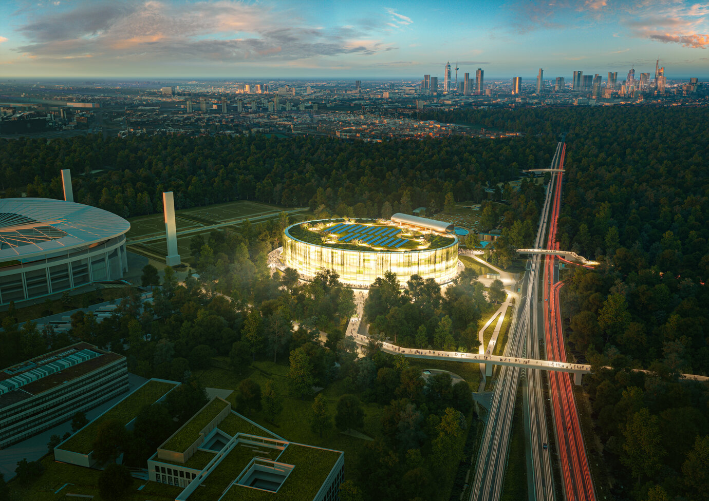 A multifunctional arena in the immediate vicinity of Frankfurt's Waldstadion is feasible. © AS+P Albert Speer + Partner GmbH | Visualisation: HHVision